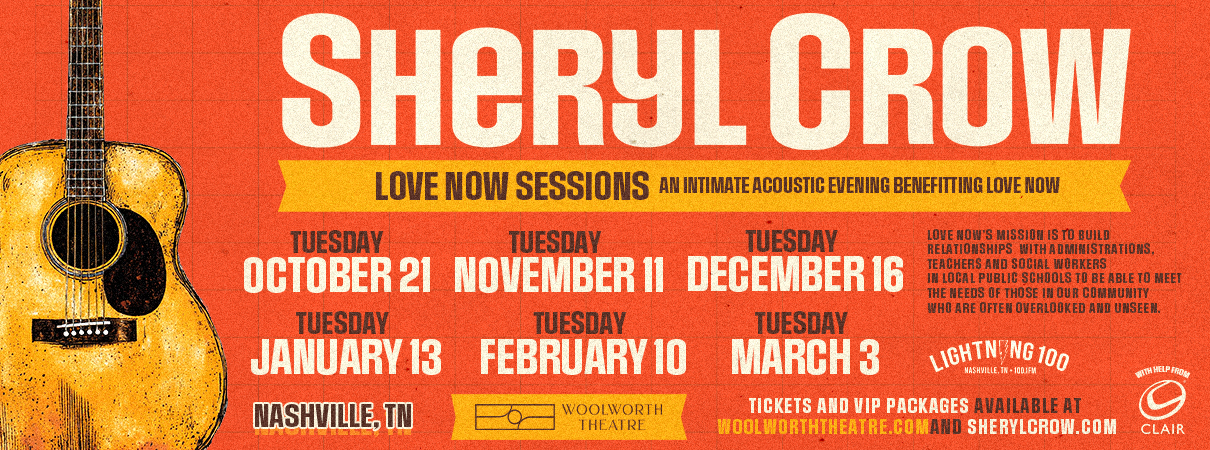 Do not miss an intimate acoustic evening with Sheryl Crow, benefitting Love Now, right here at the Woolworth Theatre. Love Now’s mission is to build relationships with administrations, teachers and social workers in local public schools to be able to meet the needs of those in our community who are often overlooked and unseen.